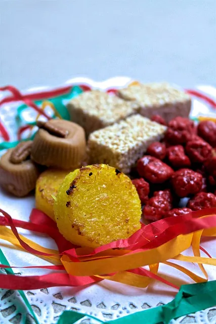 Pepitorias: Colorful! These sweets are made with bright-colored wafers, a solid caramel mixture, and pumpkin seeds.