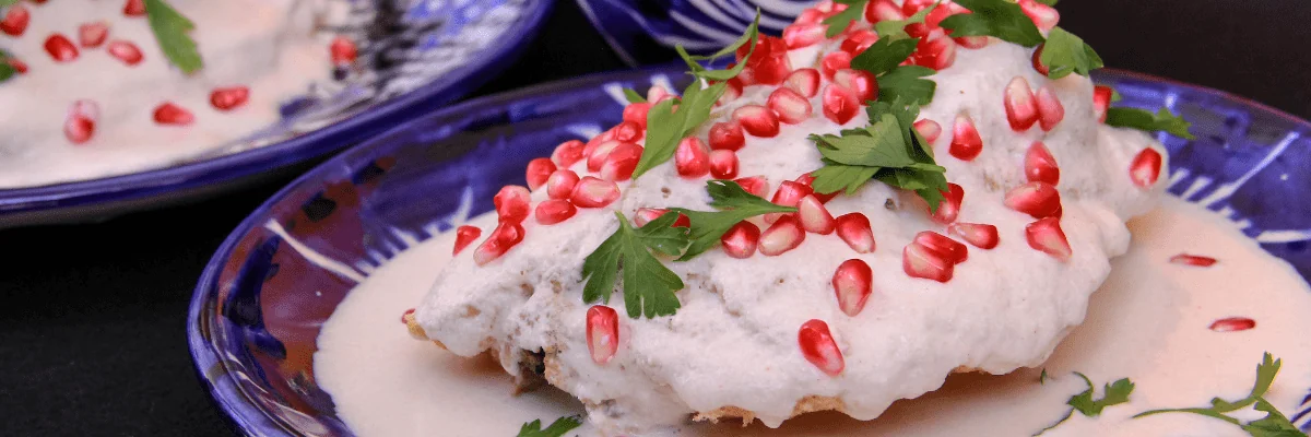Su sabor es único porque mezcla lo dulce, lo salado y lo ligeramente picante en un solo bocado. La nogada aporta una cremosidad inigualable, el relleno ofrece matices gracias a las frutas y especias, y la granada le da frescura y un toque crujiente. No es de extrañar que solo se prepare en temporada, de agosto a septiembre, cuando la nuez y las frutas están en su mejor momento.